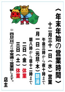 年末は12月31日(水)午後3時から夜10時(最終受付9時半)まで営業いたします。年始1月1日(木・元旦)は朝8時から昼12時まで『朝湯』を開催いたします。※午後は営業いたしません。2日(金)、3日(土)は振替休業し4日(日)より通常営業となります。よろしくお願いいたします。
