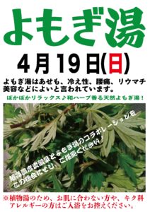 4月のよもぎ湯 2026.04.12 4月19日(日)は、よもぎ湯を開催いたします。和ハーブ「よもぎ」の超高濃度炭酸泉が楽しめます☺️身も心もすっきりリラックスして、無病息災を祈りましょう♪ Tweet Share Hatena Pocket RSS feedly Pin it 入浴料金改定 前の記事